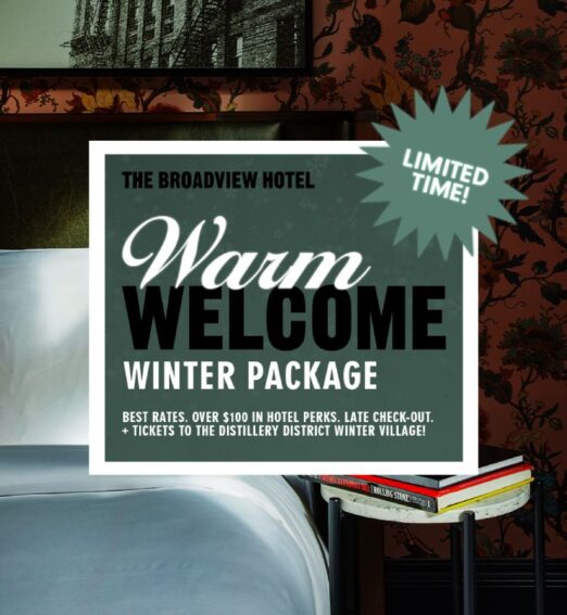 Special Offers at The Broadview Hotel Discover exclusive deals available at our historic east end Toronto hotel. Warm WelcomeYour cozy escape awaits. Book this package and enjoy breakfast for two, Rooftop cocktails, Distillery Winter Village tickets, late check-out and more. Available for a limited time.Broadview Key ClubBeing a member has its perks. Join our Key Club and score 10% off rooms, late check-out, and special offers at HISTORY and Rise Cycle.Stay a WhileSettle in and stay longer for less. Save 15% and earn 500 Aeroplan points when you book 3 nights or more. Key Club: Extra SavingsBook multiple rooms with Key Club and enjoy 15% off your first two rooms and 10% off the rest + member perks.Get a Room PackageEnjoy a night away with someone special. Our Get a Room Package includes a guest suite of your choice, in-room bottle of bubbles, and breakfast for 2 in the bistro.Group Stays Made EasyLooking to book 5 rooms or more? Connect with our team to unlock an exclusive group discount.Load more(Now showing 6 of 6) FOLLOW @BROADVIEWHOTEL Cheers to our favourite time of the day! 🍹 Happ A place to pause, recharge and savour. Join us City escape with your best friends? Yes please! Happy hour just got a little bit happier, now exte Newsletter Signup An Experience Unlike Any Other Awaits You. The Broadview Hotel